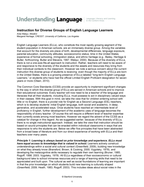 The brief also provides instructional strategies that will help students strategically use their first language to access texts and participate in activities while they are simultaneously learning English. In so doing, teachers can build into their lessons powerful opportunities for students to simultaneously develop conceptual knowledge and skills in a discipline while they are expanding sophisticated understandings of both their first language and English.