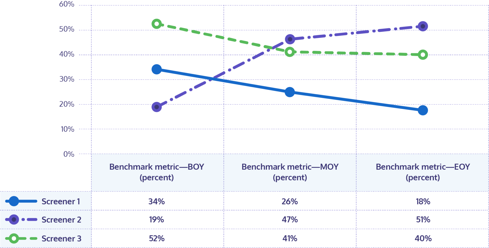 One logical approach to measuring change is to examine the percentages of students flagged by a screener over time. A decline in the percentage of students identified as at risk would seem to indicate improvement, and an increase would suggest a problem. Unfortunately, things are not quite so straightforward.