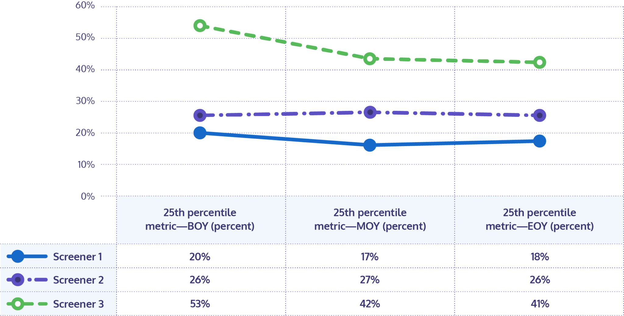 For screeners 1 and 3, the percentages of students identified as at risk using publisher-provided benchmarks and the 25th percentile decrease from beginning to end of year. That provides some evidence that there has been real improvement in student performance over time.