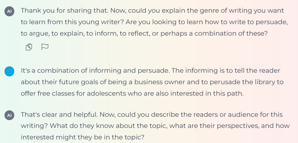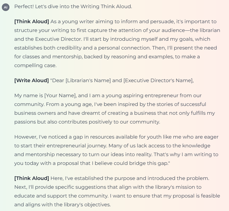 In addition, during professional learning, teachers have access to intentionally designed GenAI-powered apps—such as Writing Out Loud*—that simulate a writer’s thinking as they draft in their area of expertise. Teachers input the type of writer they wish to learn from (e.g., storyteller, political analyst, lawyer) and the genre, purpose, and intended audience. These inputs provide the app with the necessary parameters to develop an exemplar Writing Think Aloud to support the teacher’s growth. By combining pedagogical intentionality with GenAI’s capabilities, we can ensure that writing instruction remains human-centered—fostering student voice, agency, and authentic engagement in the writing process. In Figures 1 and 2, we offer a look into how Writing Out Loud simulates the mental processes that are specific to writing to both inform and persuade a community-based organization.