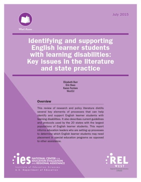 Accurately identifying the nature of learning challenges is vital to ensuring that students in the nation’s growing English learner (EL) population receive the supports they need to succeed in school. Current systems do not always correctly identify learning disabilities among English learners, and even EL students who have been identified to receive special education services often continue to struggle academically.1 Recently, the Regional Educational Laboratory West (REL West) at WestEd has produced much-needed guidance on this topic in a comprehensive report, Identifying and Supporting English Learner Students with Learning Disabilities: Key Issues in the Literature and State Practice, and an accompanying resource brief.