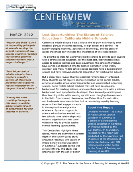 California’s middle schools have the potential to give students the kind of science instruction consistent with the National Research Council’s Framework for K-12 Science Education. However, major challenges limit opportunities for science learning, leaving that potential unfulfilled.