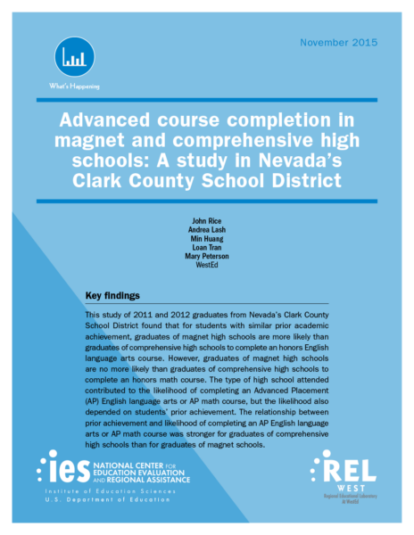 WestEd has made substantial progress on the evidence of promise study for Clark County School District’s (CCSD) 2017 Magnet Schools Assistance Program (MSAP) grant. WestEd collected the necessary student-level test score, course credit, and demographic data from CCSD for the study to identify statistically significant or substantively important effects of the MSAP-funded schools on student outcomes.