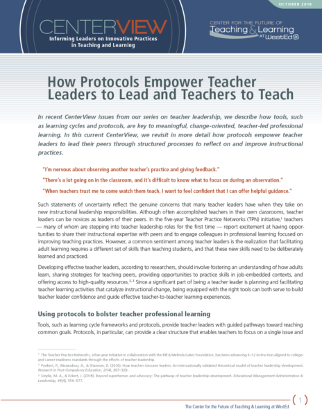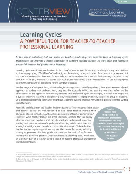 In Teacher Practice Networks (TPN), an initiative of the Center for the Future of Teaching & Learning at WestEd, teacher leaders lead sustained, professional learning to advance K–12 instructional practices aligned to college- and career-readiness standards. Multi-year data from the TPN indicates how a learning cycle helps teacher leaders intentionally plan effective professional learning with activities that engage other teachers in learning new content, applying it in practice, reflecting on implementation, reiterating lessons, and refining instruction.