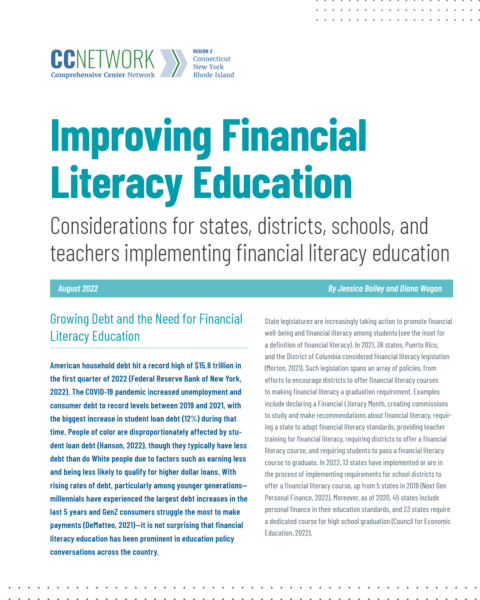 The content is informed primarily by the Region 2 Comprehensive Center’s (R2CC’s) technical assistance in Rhode Island in 2021–22, which entailed supporting state education agency staff to understand districts’ current levels of implementation and anticipated challenges with meeting the legislative requirements of financial literacy policies.