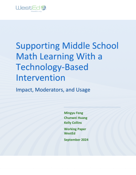 Feng, M., Huang, C.-W., & Collins, K. (2023). Technology-based support shows promising long-term impact on math learning: Initial results from a randomized controlled trial in middle schools. WestEd. https://www.wested.org/resources/technology-based-support-shows-promising-long-term-impact-on-math-learning-2/