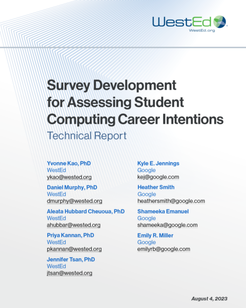 Kao, Y., Murphy, D. L., Hubbard Cheuoua, A., Kannan, P., Tsan, J., Jennings, K. E., Smith, H., Emanuel, S., & Miller, E. R. (2023). The development and validation of a survey to predict computing career intentions. In K. Fisler, P. Denny, K. Franklin, & M. Hamilton (Eds.), ICER ’23: Proceedings of the 2023 ACM Conference on International Computing Education Research (Vo. 1, pp. 256–269). Association for Computing Machinery.