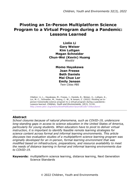 Li, L., Hayakawa, M., Freese, J., Daniels, B., Weiser, G., Luttgen, K., Lor, M. C., Schneider, M., Huang, C.-W., & Jensen, E. (2022). Pivoting an in-person multiplatform science program to a virtual program during a pandemic: Lessons learned. Children, Youth and Environments, 32(3), 53–81. https://doi.org/10.1353/cye.2022.0023
