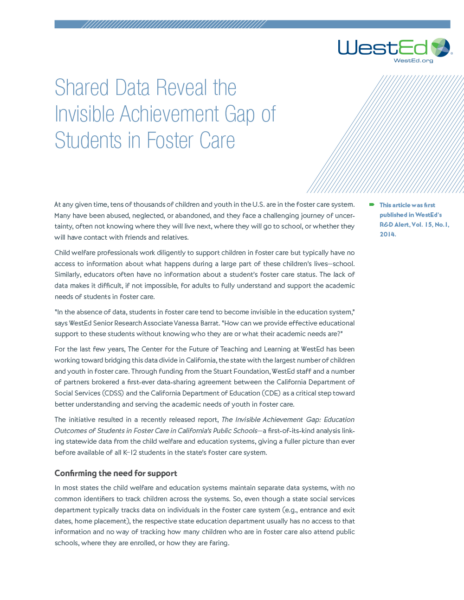 Released by WestEd nearly 12 years ago, The Invisible Achievement Gap: Education Outcomes of Students in Foster Care in California’s Public Schools examined the educational progress of students in foster care and provided a series of recommendations for improving supports for them. The follow-up study, Revisiting California’s Invisible Achievement Gap: Trends in Education Outcomes of Students in Foster Care in the Context of the Local Control Funding Formula, analyzes educational trends among California youth in foster care from 2014 to 2023—a transformational decade featuring significant policy reform to the state’s school funding system and a global pandemic.