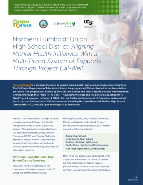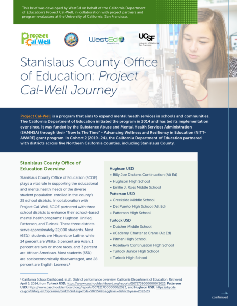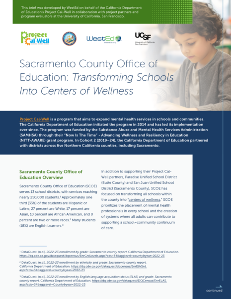 This brief was developed by WestEd on behalf of the California Department of Education’s Project Cal-Well in collaboration with project partners and program evaluators at the University of California, San Francisco. It focuses on the Sacramento County Office of Education (SCOE) and its efforts to transform schools into centers of wellness.