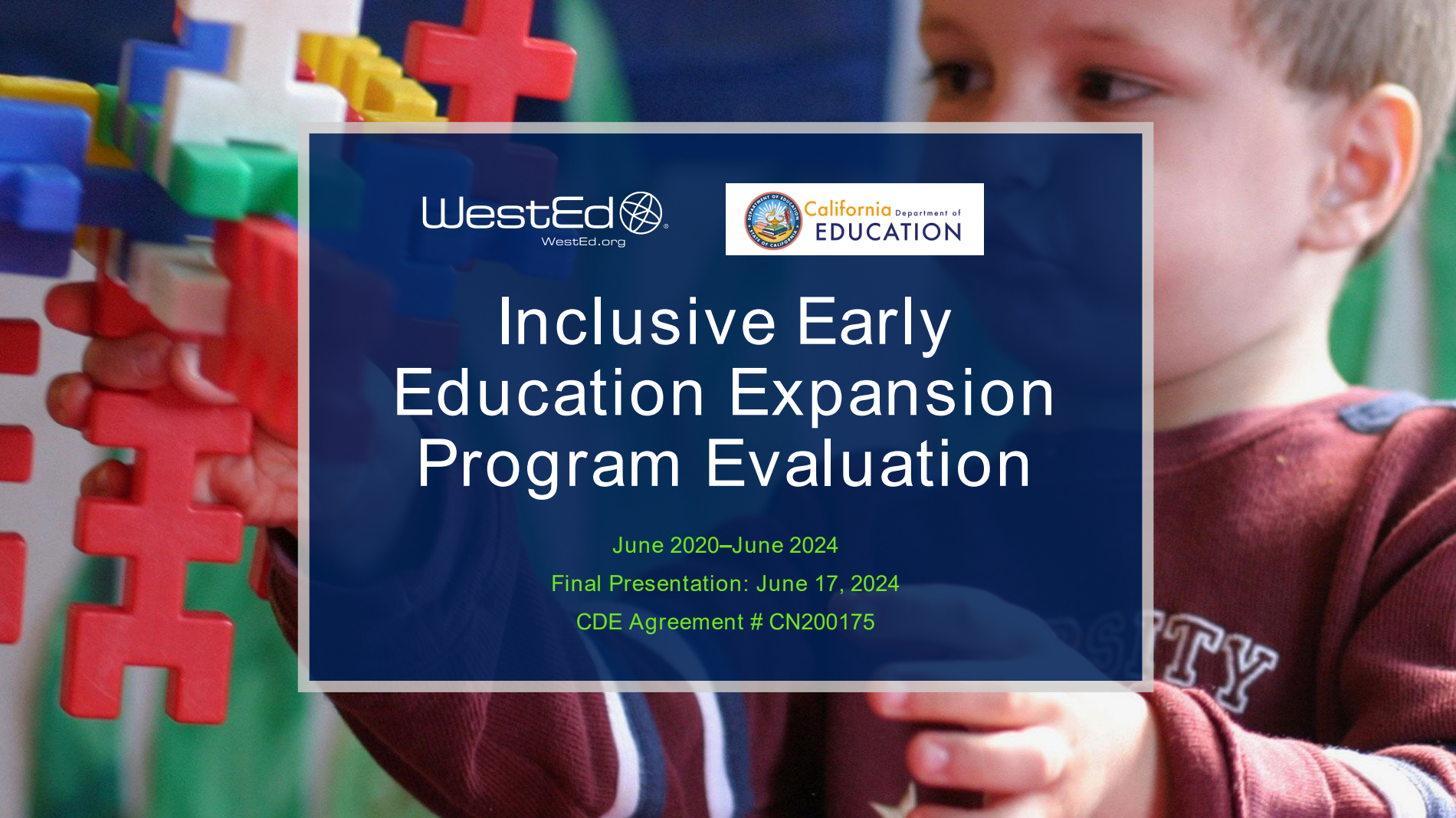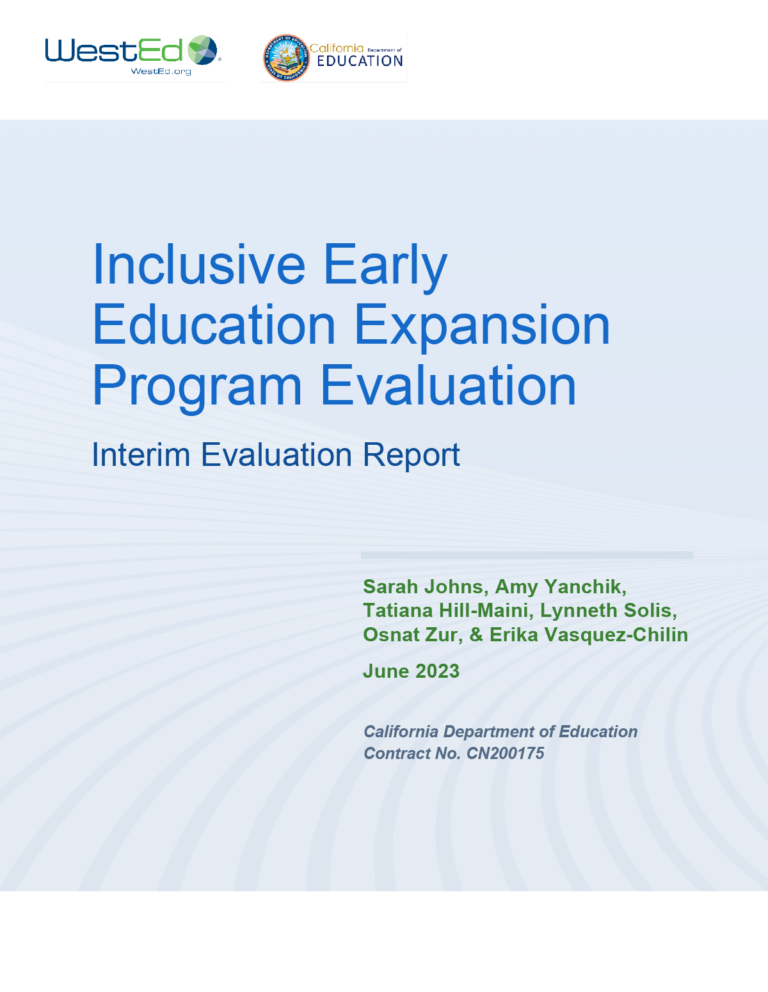 To support the expansion of inclusive early education programs for children with disabilities, WestEd partnered with the California Department of Education to evaluate the Inclusive Early Education Expansion Program (IEEEP). This statewide initiative aimed to improve access to high-quality, inclusive early education programs for children with disabilities, including those with significant or severe conditions. The state provided funds for 65 local education agencies in California to invest in partnerships, professional development, facility improvements, and adaptive equipment purchases. WestEd conducted a mixed methods evaluation, collecting child enrollment data and garnering perspectives on expansion efforts from district and county offices of education staff, collaborative community agencies, early education program leaders, educators, and families of children with and without disabilities.