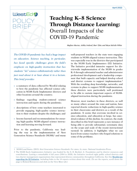 This brief describes challenges teachers experienced teaching K–8 science through distance learning and explains how teaching conditions during the pandemic affected the specific types of instruction that are consistent with the intent of the NGSS. The brief also presents a variety of successes by teachers and districts, and it concludes with recommendations and reasons for districts to support science, even during a pandemic.