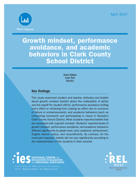 Snipes, J., & Tran, L. (2017). Growth mindset, performance avoidance, and academic behaviors in Clark County School District (REL 2017-226). U.S. Department of Education, Institute of Education Sciences, National Center for Education Evaluation and Regional Assistance, Regional Educational Laboratory West. https://files.eric.ed.gov/fulltext/ED573495.pdf