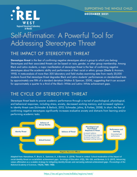 Snipes, J., & Jacobson, A. (2021). Self-affirmation: A powerful tool for addressing stereotype threat (REL 2022–123). U.S. Department of Education, Institute of Education Sciences, National Center for Education Evaluation and Regional Assistance, Regional Educational Laboratory West. https://ies.ed.gov/ncee/rel/regions/west/relwestFiles/pdf/4-2-3-35_Self-Affirmation_Infographic_508C.pdf?_ga=2.267433741.2019888248.1719242154-1317899479.1697835907