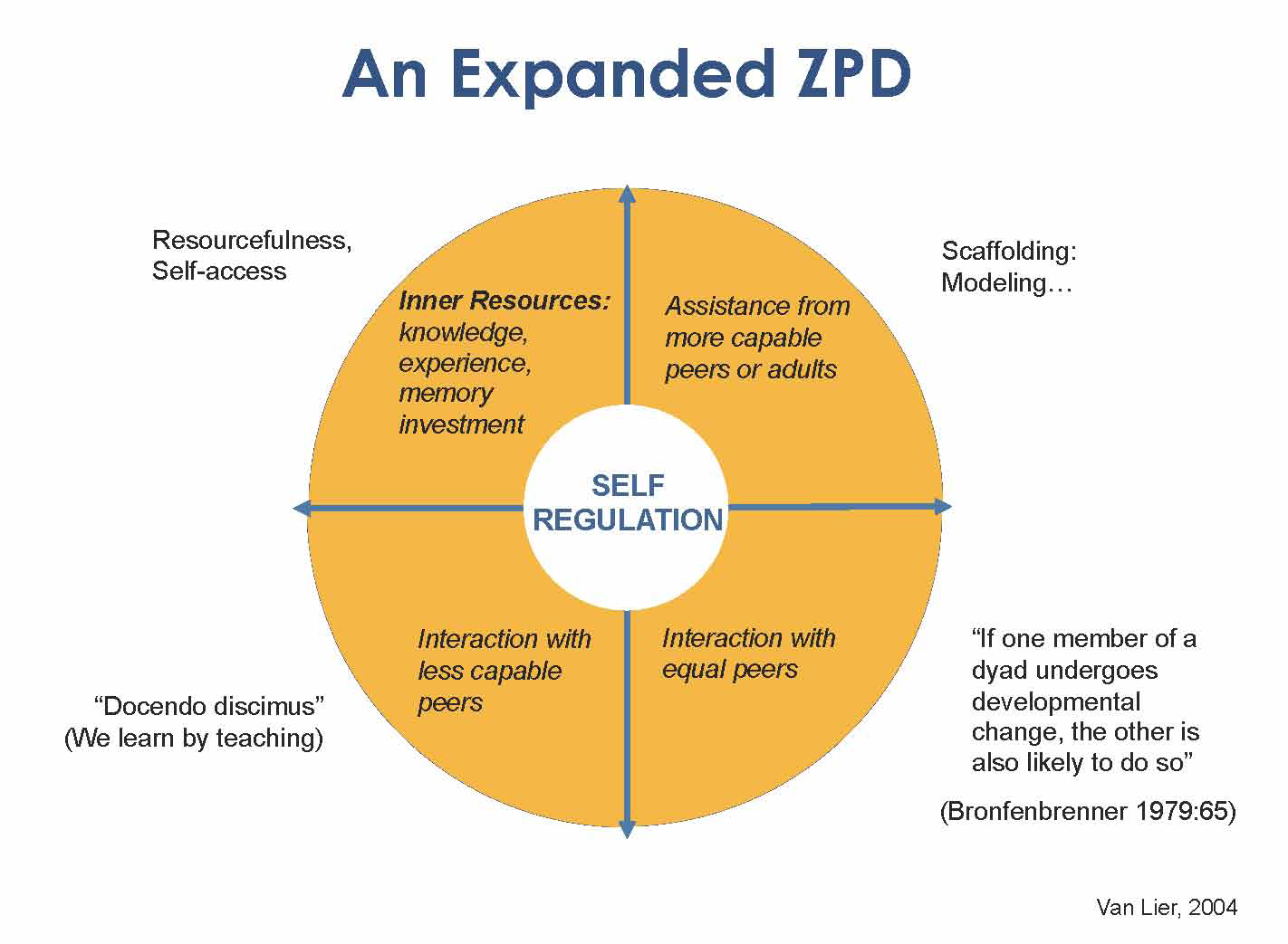 - Less capable peers (a novice supporting another learner) (van Lier, 1996, 2004 in Walqui & van Lier, 2010). When a novice learner teaches another learner who has slightly less knowledge, the interaction supports both learners working in the zone of proximal development; as the novice articulates, expands, and clarifies ideas, both learners simultaneously are expanding their knowledge.