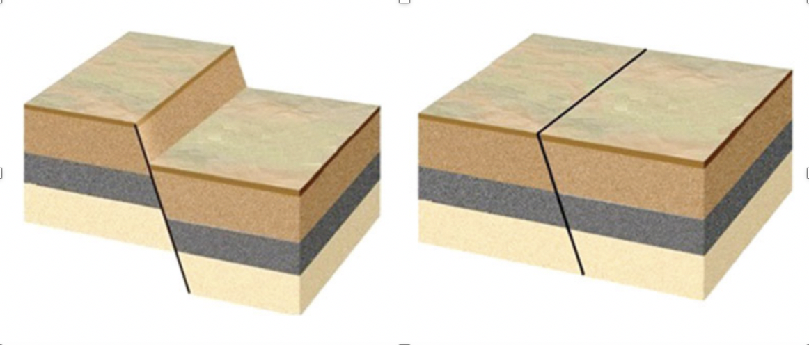 Figure 2. A geological fault (left) and a geological fracture with no fault (right). Students can better understand each spatial concept when they compare the two visuals.