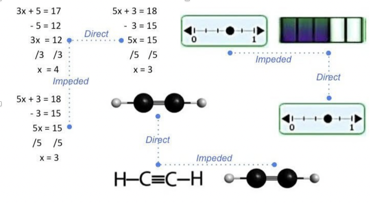 Figure 3. Direct (most effective for learning) and impeded comparisons in STEM. For example, in the comparison of molecules, each visual has atoms displayed from left-to-right (H-C-C-H). Therefore, the optimal placement is from top-to-bottom, as the corresponding atoms have a direct and clear path to one another. In the left-to-right (impeded) placement, two carbon atoms and a non-analogous hydrogen atom intervene between corresponding hydrogen atoms, making the comparison more difficult.