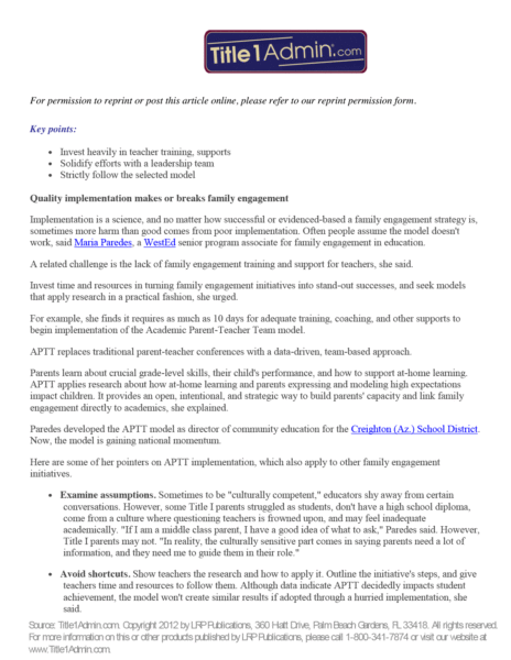 With a focus on pioneering educational approaches, charter schools embrace new methods that encourage active family involvement. Their adaptable structures enable charter schools to tailor educational experiences to meet the needs of their communities. Charter schools can implement and refine effective family engagement models, such as Academic Parent–Teacher Teams (APTT), to support family-centered objectives effectively. With close ties to local communities, charter schools are well-positioned to engage and collaborate with families and tailor activities and decisions based on direct feedback.