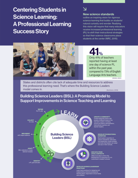 States and districts often cite lack of adequate time and resources to provide the professional learning needed to meet the vision of the Next Generation Science Standards. The Building Science Leaders model, developed by WestEd’s SCALE Science and K–12 Alliance teams, addressed these needs by creating a statewide community of practice made up of district teams, including school and district administrators, instructional coaches, and teacher leaders.