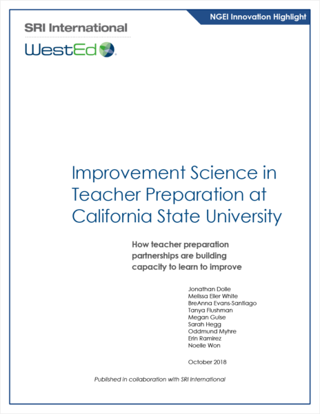 Dolle, J. R., White, M. E., Evans-Santiago, B., Flushman, T., Guise, M., Hegg, S., Myhre, O., Ramirez, E., & Won, N. (2018). Improvement science in teacher preparation at California State University: How teacher preparation partnerships are building capacity to learn and improve. Innovation Highlight: New Generation of Education Initiative.