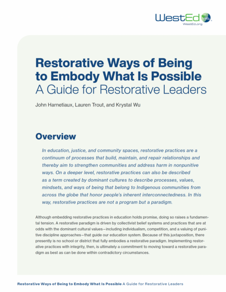 - Strategies: the “how,” offering some ways to rethink and redesign education systems as well as some preventative and restorative strategies, with specific examples