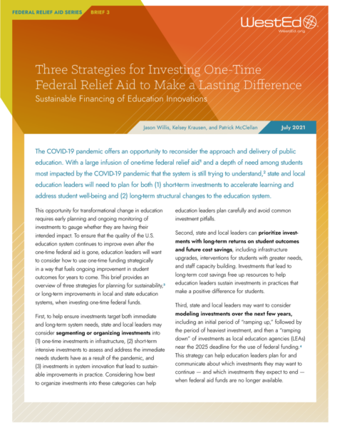 As leaders seek to invest one-time funds in a sustainable and equitable way, they are confronted with competing priorities, staffing shortages, and other challenges. Narrated by WestEd leaders, these short videos highlight best practices and are accompanied by practical tools to support education leaders in their use of state and federal one-time funds.