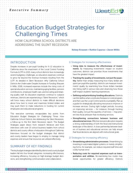 This executive summary outlines key budget strategies identified in the follow-up report, Education Budget Strategies for Challenging Times: How California School Districts Are Addressing the Silent Recession. These strategies fall into four broad categories: increasing effectiveness, increasing efficiency, focusing on high-leverage budget decisions, and strengthening communication and collaboration.