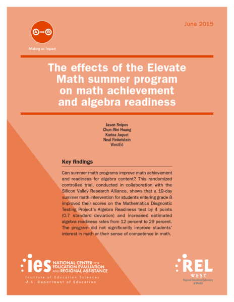This study, prepared by Regional Educational Laboratory West (REL West), examines the effects of the Elevate Math program on student achievement. Designed by the Silicon Valley Foundation, Elevate Math aims to help students succeed in middle school math and master important math and science skills that are needed to excel in college and career.