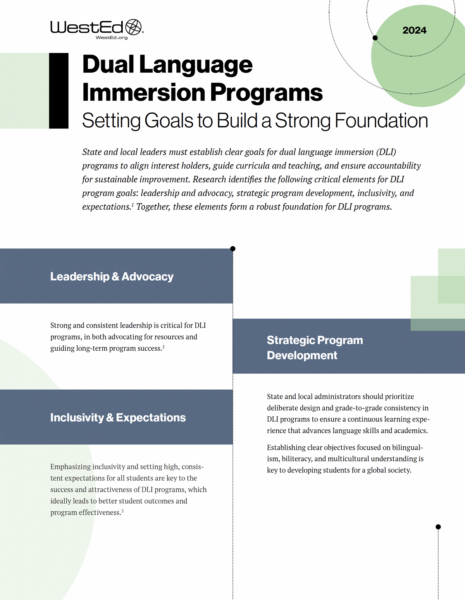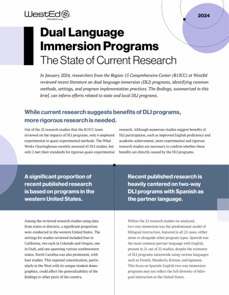 Researchers from the Region 15 Comprehensive Center at WestEd reviewed recent literature on dual language immersion (DLI) programs, identifying common methods, settings, and program implementation…