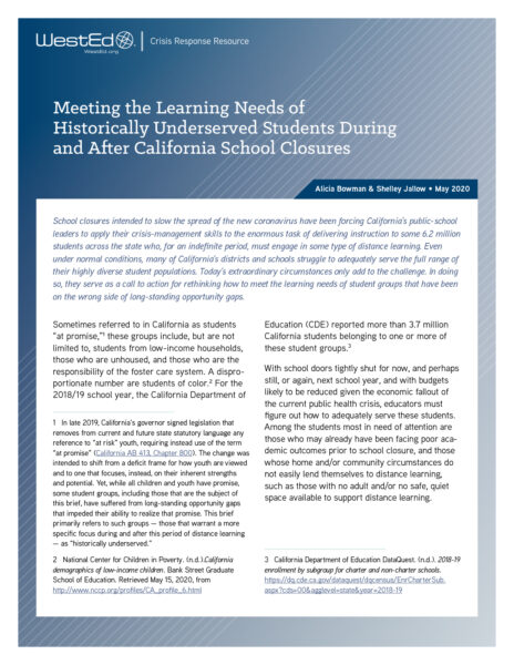 This report, commissioned by the Bay Area Geographic Leads Consortium, explores how five county offices of education and local school districts pivoted to reach, teach, and support the holistic needs of students experiencing homelessness during the COVID-19 pandemic.