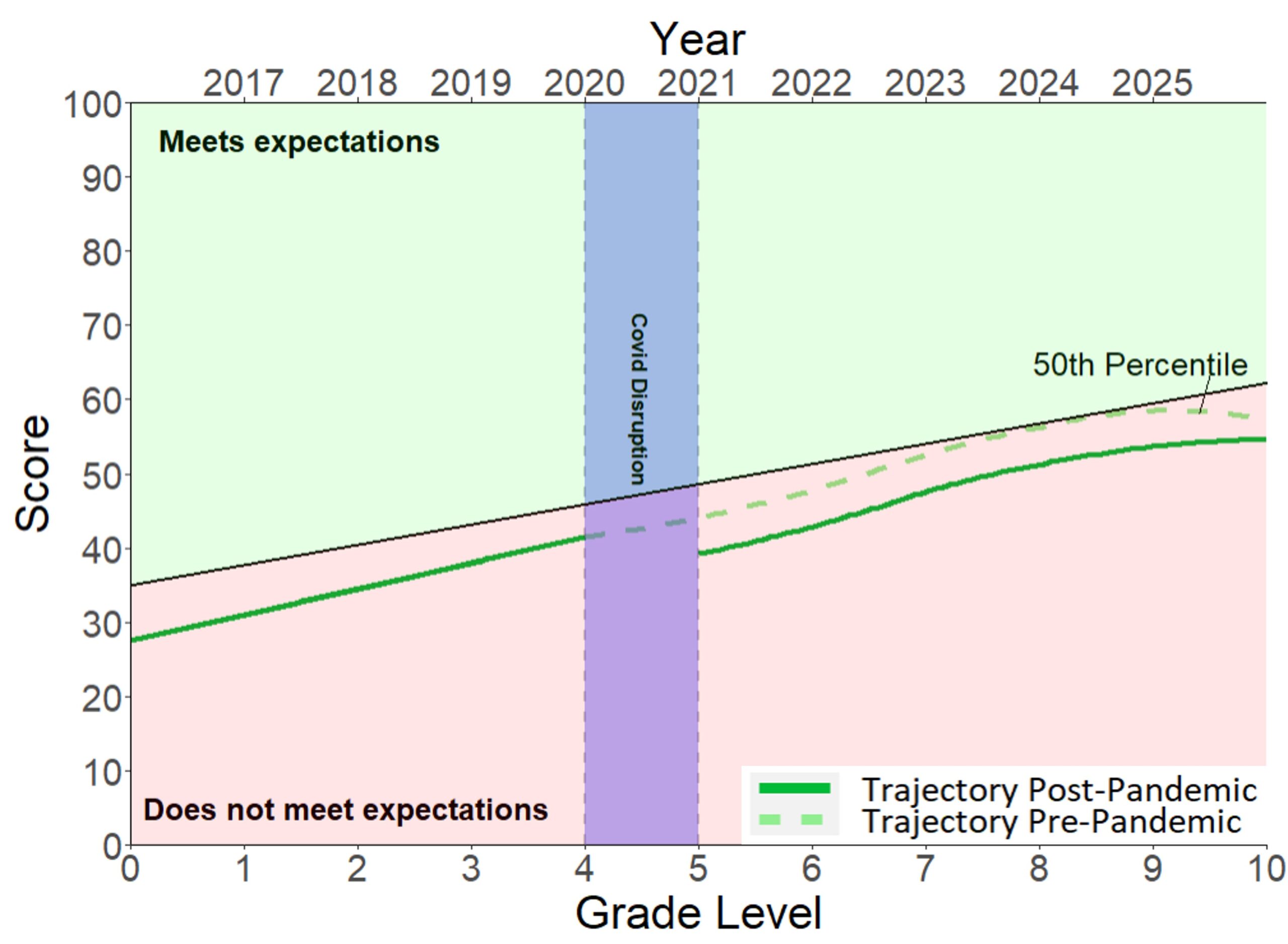 Figure 3. How a trajectory that was on track to meet expectations will not meet expectations after the COVID-19 disruption without targeted instruction.
