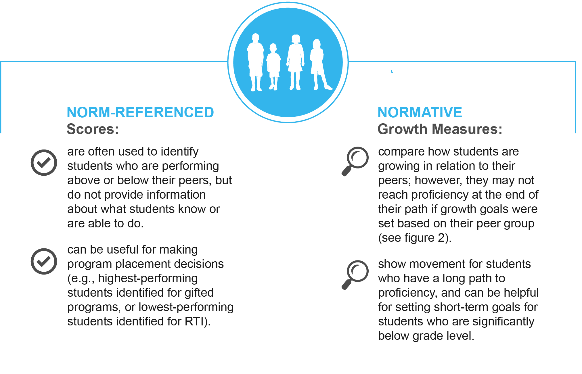 Normative growth measures are growth trajectories based on percentiles. They examine how much a student grows, compared to other students. A common example is the growth chart found in every pediatrician’s office. These types of measures provide useful information on expected student performance, relative to their peers, over time, and highlight when a student is growing faster or more slowly, compared to their peer group. But relying solely on normative growth goals may not lead to proficiency, since grade-level proficiency is based on content standards, not on relative standing among peers. Norm-referenced growth can show movement for students who have a long path to proficiency, which can be helpful for setting short-term goals for students who are significantly below grade level.