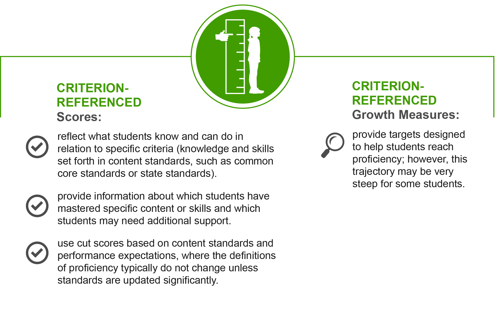Criterion-referenced growth measures, such as growth-to-standard measures, provide feedback to students to help them make progress toward the next performance level. These measures identify where a student is scoring on the scale and where they need to score to reach proficiency. Content strengths and weaknesses are identified, and a growth path tied to proficiency is outlined for students. This standards-based feedback can be used to inform instruction, which is a key distinction between criterion-referenced growth and norm-referenced growth. While criterion-referenced growth targets are designed to help students reach proficiency, this trajectory may be very steep for some students. Many assessment systems provide both norm- and criterion-referenced scores.