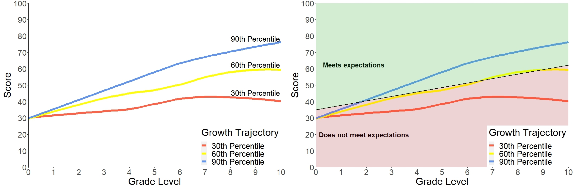 Figure 2: The left plot shows normative growth measures; the right plot adds the criterion-referenced proficiency expectation.