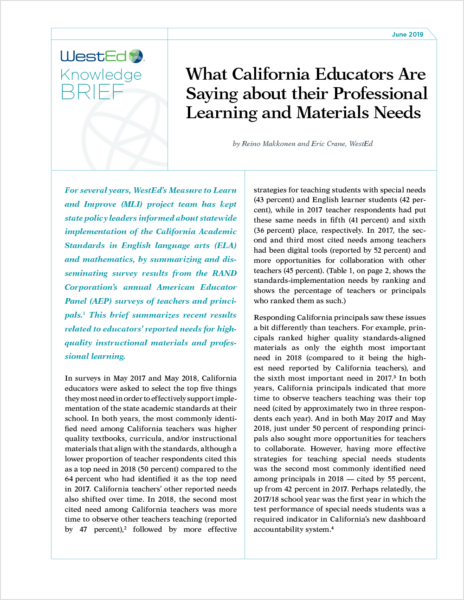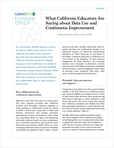 For several years, WestEd’s Measure to Learn and Improve project team has kept state policy leaders informed about statewide implementation of the California Academic Standards in English language arts and mathematics, by summarizing and disseminating survey results from the RAND Corporation’s annual American Educator Panel surveys of teachers and principals.