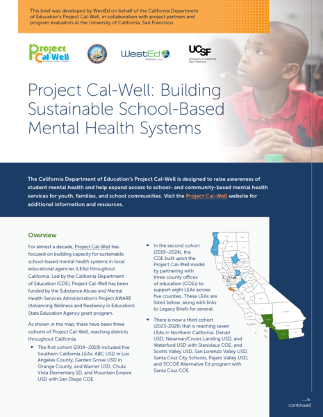This brief was developed by WestEd on behalf of the California Department of Education’s Project Cal-Well in collaboration with project partners and program evaluators at the University of California, San Francisco. It focuses on the Sacramento County Office of Education (SCOE) and its efforts to transform schools into centers of wellness.