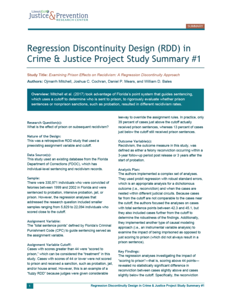 This brief discusses the potential benefits and underutilization of Regression Discontinuity Design (RDD) in evaluating justice interventions. RDD is highlighted for its ability to credibly estimate causal impacts by comparing outcomes for individuals near a predetermined cutoff, making it a valuable alternative when Randomized Controlled Trials (RCTs) are not feasible. Despite its methodological strengths, the use of RDD in justice settings remains infrequent due to factors such as lack of awareness and challenges in identifying appropriate contexts. The authors provide several recommendations to promote RDD, including intentional naming in Requests for Proposals, targeted training for researchers, and raising awareness among policymakers. They emphasize the importance of collaboration with government researchers and the development of an RDD registry to share successful applications. The paper calls for a wider adoption of RDD in order to enhance evidence-based decision-making in crime and justice policy.