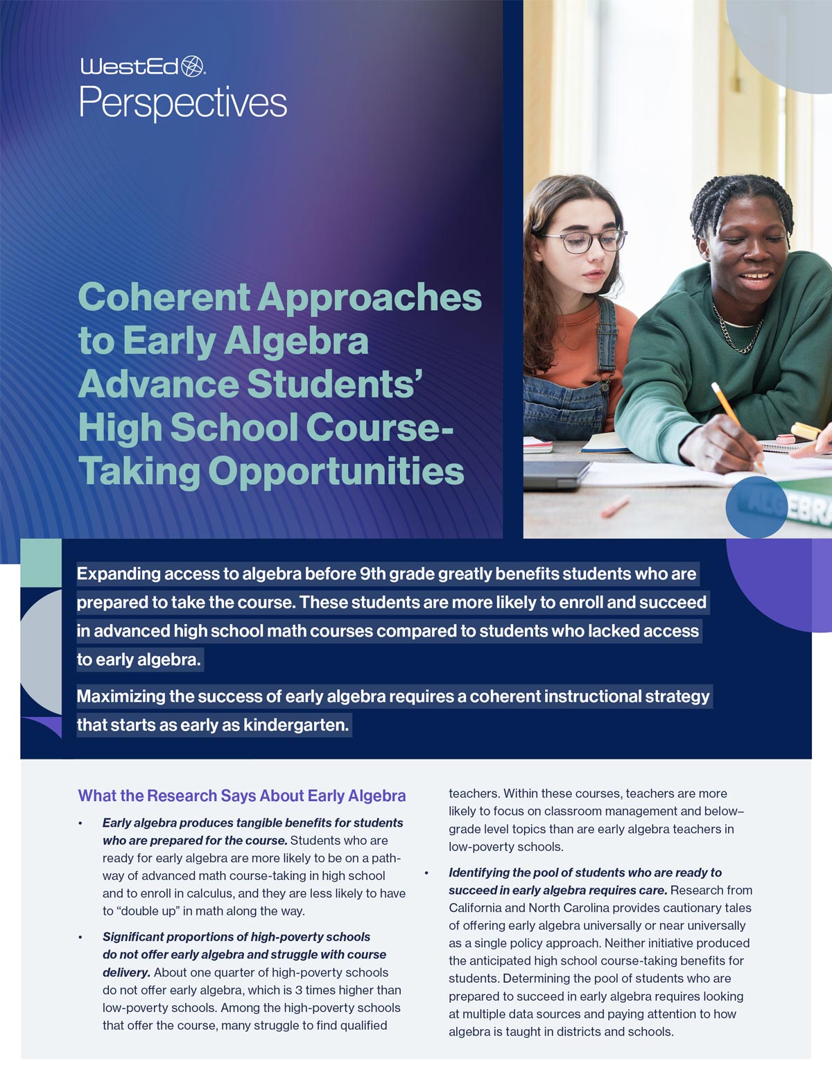 This brief provides guidance on how state and local policymakers can support more students’ successful completion of algebra before high school and shares how WestEd can help in those efforts.