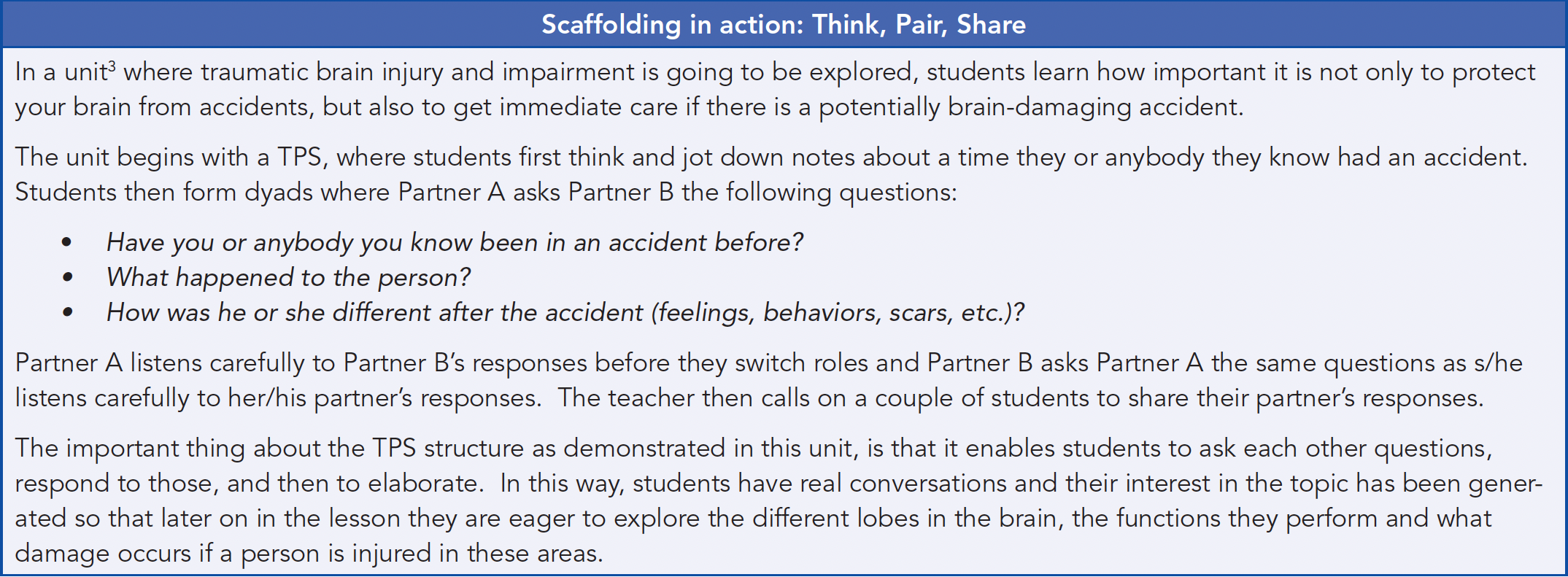 Scaffolding involves both the structural and procedural supports that guide and enable learners to work within their ZPD so that they may develop their full, yet unrealized, potential. The structural element of scaffolding refers to those planned, ritualized structures that surround learning tasks. An example of structural scaffolding is the step-by-step guidelines used in a Think, Pair, Share (TPS) task.2 There are three moments in a TPS task: