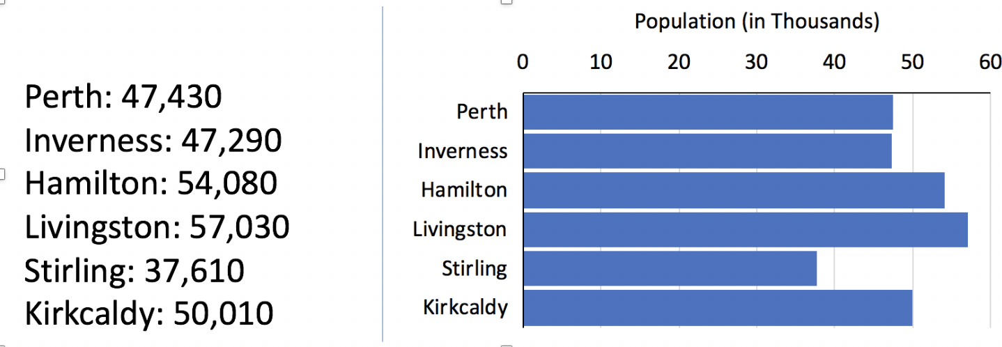 Most likely you chose the graph, which allows our visual system to effortlessly spot the relative population sizes. The ease and rapidity with which our brains process visual information paves the way for us to perform further reasoning, such as estimating the average population size. This is because the data are presented spatially, and our visual system is evolutionarily equipped to efficiently process spatial information.