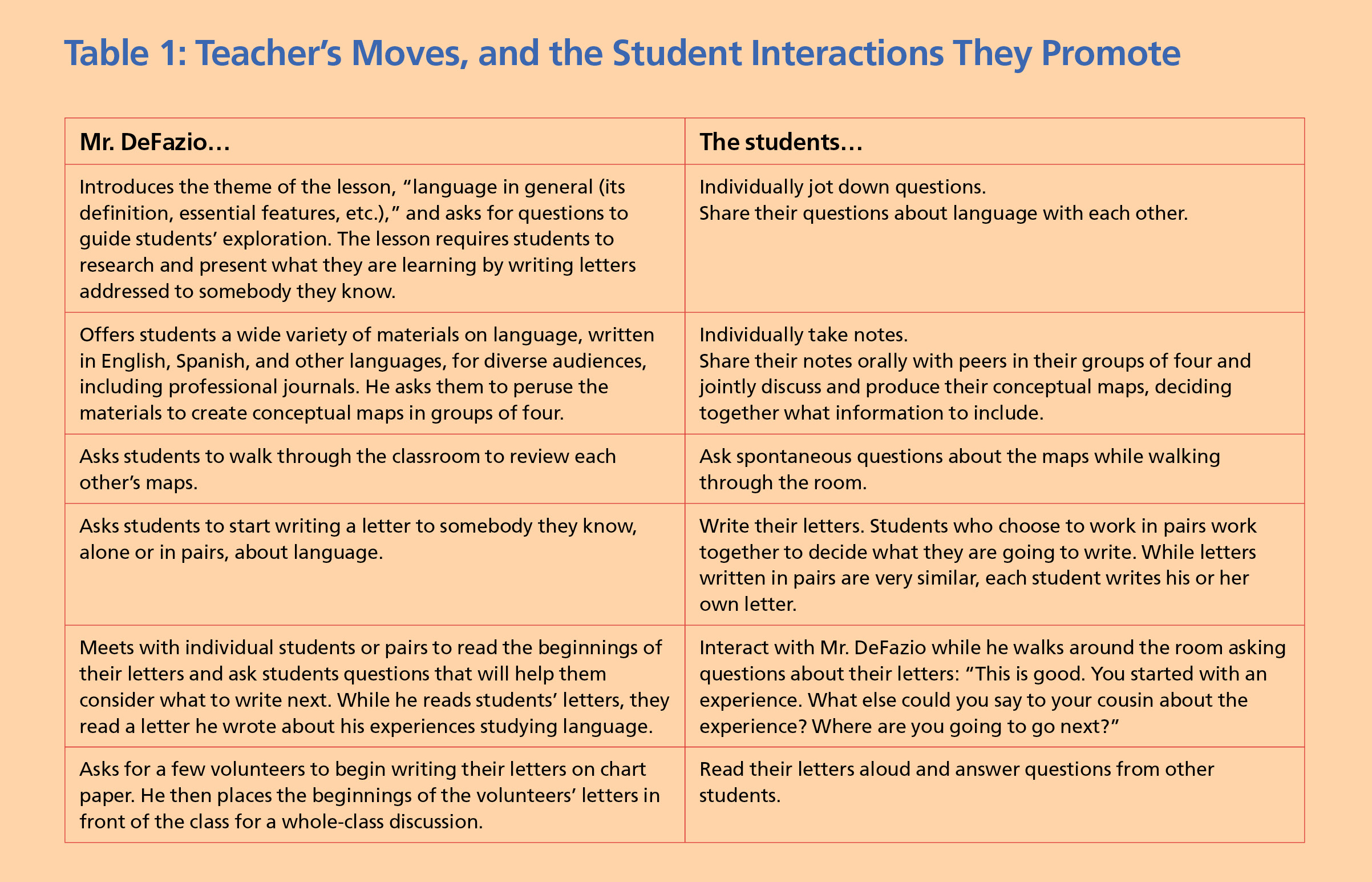 Now consider these characteristics in an English for Speakers of Other Languages (ESOL) class, which comprises students with varied levels of English competence.7 “Language” is the theme of the students’ exploration, and this was the third class on the topic. Table 1 below shows the deliberate moves of the teacher, Mr. DeFazio, during the lesson and the students’ interactions. The text in the table indicates the multiple instances of productive talk that he promotes with his directions and actions.