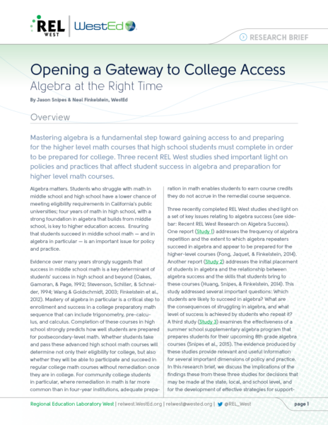 This study, prepared by Regional Educational Laboratory West (REL West), examines the effects of the Elevate Math program on student achievement. Designed by the Silicon Valley Foundation, Elevate Math aims to help students succeed in middle school math and master important math and science skills that are needed to excel in college and career.