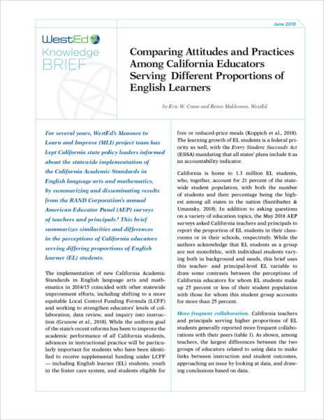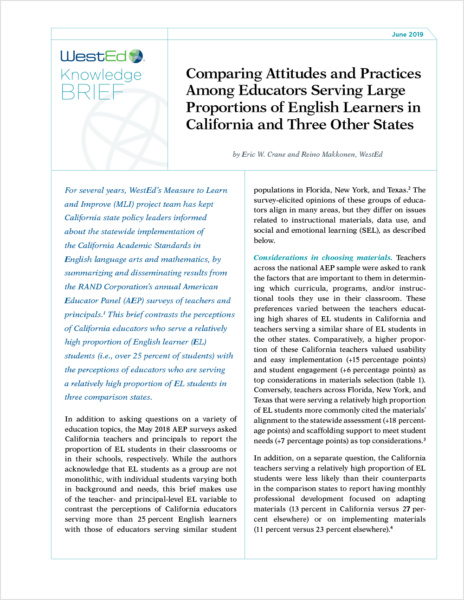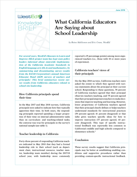 For several years, WestEd’s Measure to Learn and Improve project team has kept state policy leaders informed about statewide implementation of the California Academic Standards in English language arts and mathematics, by summarizing and disseminating survey results from the RAND Corporation’s annual American Educator Panel surveys of teachers and principals.